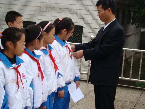 在飘扬的队旗下,队员们唱响了《中国少年先锋队队歌》。鲜艳的红领巾映红了孩子们的脸庞,嘹亮的歌声响彻了校园每一个地方。总辅导员宣读了新一届大队委员名单,钱校长和邱校长亲手为新任大队委员佩戴标志。在大队长的带领下,少先队小干部们面向队旗庄严宣誓:“……忠于职守,服务队员;勤奋学习,求是创新……”接下来辅导员高老师为礼仪讲坛授课,她带着五名少先队员边讲解,边示范,为队员们作了“系标准领巾,敬标准队礼”的讲座。