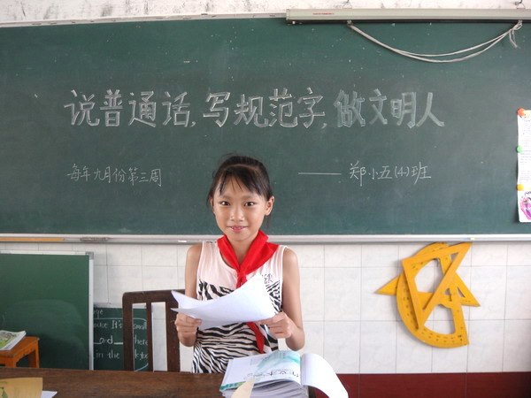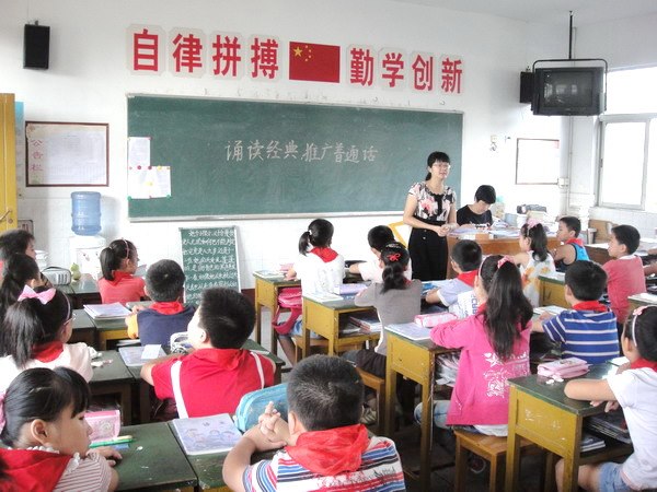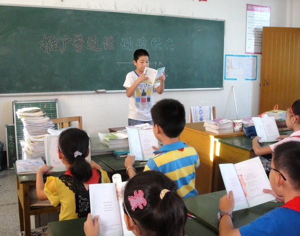 “说普通话,写规范字”,作为我们学校推广普通话的目标,一直镌刻在教学楼墙壁上,它时时刻刻提醒全体师生为之努力;楼梯拐角处,文明十字用语每天都在悄悄地告诉孩子,要讲普通话,要做文明人;走进教室,“共同的语言——普通话“专题黑板报,使学生认识到语言、文字是祖国的根本,热爱祖国,首先要从用好祖国的语言文字做起。这浓郁的推普氛围潜移默化地影响、感染着全体学生。