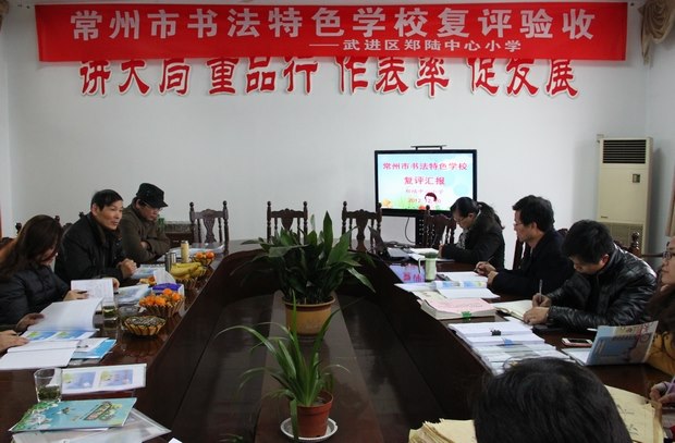 郑陆中心小学是常州市第三批书法特色学校,学校创办于1898年,具有深厚的文化底蕴和优秀的人文传统。学校多年来培植和建构书法特色教育,在当地已经成为了一张独具特色的教育名片。12月20日上午,校园内彩旗招展,常州市书法特色学校复评组专家领导一行5人,有常州市教育局基教处汤煜处长,常州市教育学会书法专业委员会卢海洲理事长、周翰凯副理事长、张军佳秘书长,武进区教育局基教科王为民副科长所组成的专家评估组,对我校进行书法特色教育三年回头看复评验收工作。