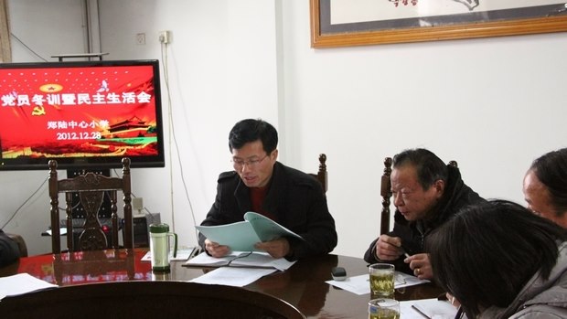为了扎实推进、认真落实郑陆镇党员冬训班会议精神,加强党员思想政治建设,充分发挥共产党员的先锋模范作用,树立党员干部良好形象,郑陆中心小学日前开展了党员冬训暨民主生活会,全体党员参加了会议,会议由钱国云书记主持。会议简朴而丰富、热烈而温馨。本次民主生活会共有三项议程。