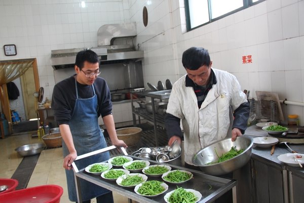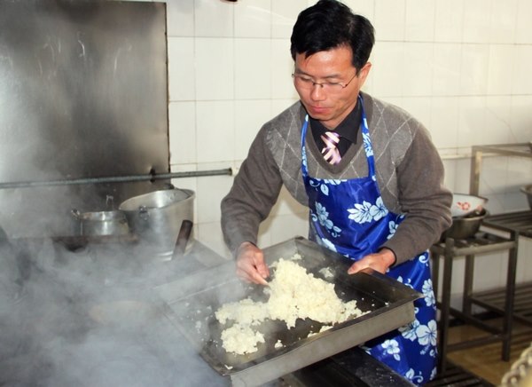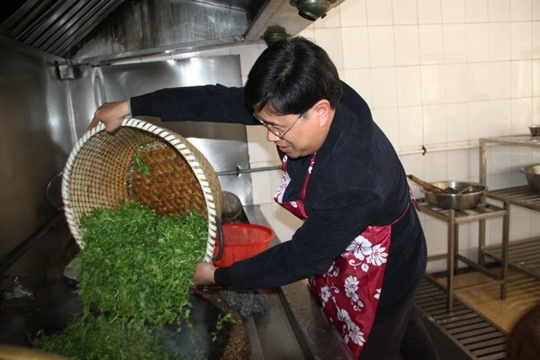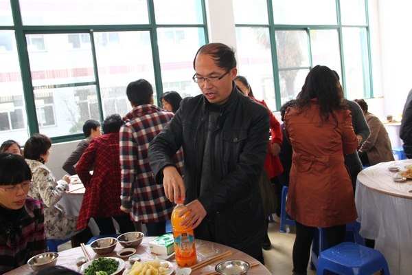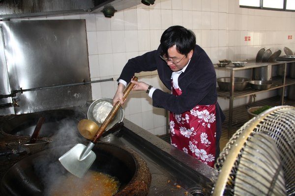 3月8日中午,学校工会做了精心安排与准备。学校的食堂里,男教师们开始张罗着洗菜、洗碗、切菜等平时难得一做的厨房事,虽然忙得不亦乐乎,但一切都在井井有条地进行着。十点半左右,材料下锅了,煎炸蒸煮炒焖炖,男教师们个个都使出了看家本领,钱国云校长也系上围裙,亲自下厨,很快整个食堂里弥漫着各种各样的香味,一道道色香味俱全的菜肴转眼间诞生了。