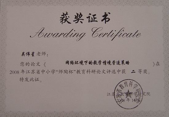 吴伟星老师论文《网络环境下的教学情景营造策略》获江苏省师陶杯论文评选二等奖