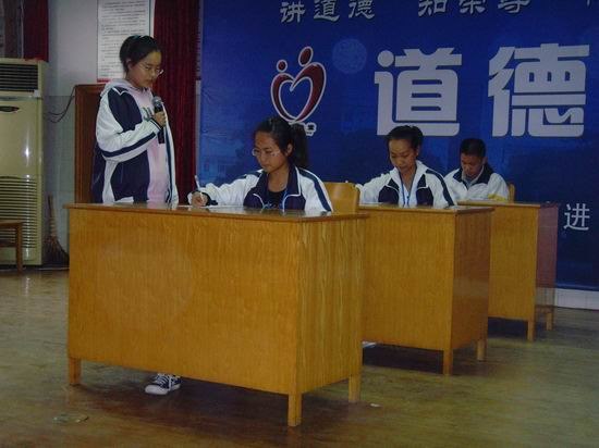 这次道德讲堂主题活动共分七个部分:第一部分全体合唱《公民道德歌》。优美的旋律,激人奋进的歌词,为整个活动定下了严肃的基调;接着学生们集体朗诵了道德经典《三字经》,这让学生们沐浴在道德的光辉中,纯洁了他们的心灵;第三部分,(3)班同学表演了一幕令人深思的小品《考场“疯”云》,这个小品非常贴近学生的实际,启迪学生去思考,对纠正学生中的不良行为,鼓励学生踏实学习、诚实做人有很好的导向作用;第四部分是两位学生宣讲他们身边的感人事迹,为全体同学树立了学习的榜样;接下来看一部短片——2010年感动中国人物——孙东林、孙水林兄弟的感人事迹。孙氏兄弟将道德演绎成了人间最悲壮的故事,他们讲道义,守信用,他们把世间最平凡的事演绎成了言忠信,行笃敬的现代传奇,他们为尊严承诺,为良心奔波。