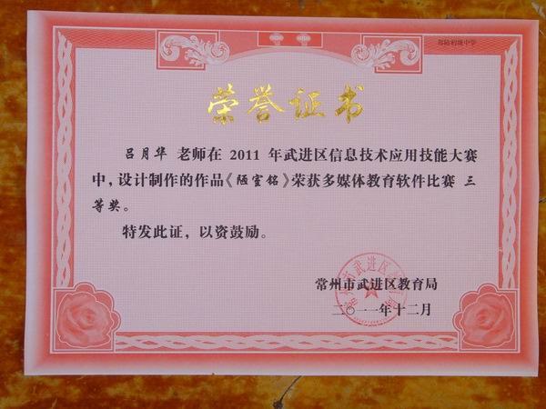吕月华在区信息技术应用大赛中设计的教育软件荣获“三等奖”