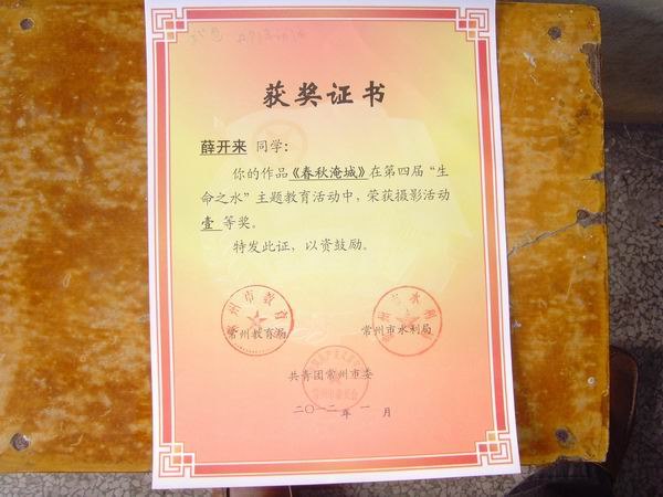 薛开来在市第四届“生命之水”主题活动中获摄影一等奖