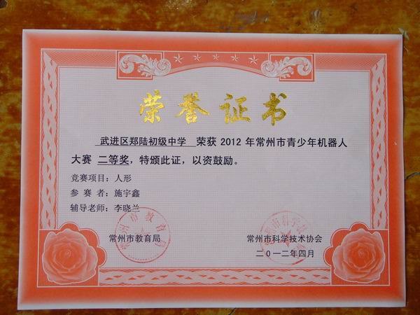 施宇鑫同学荣获常州市青少年机器人大赛“人形”项目“二等奖”