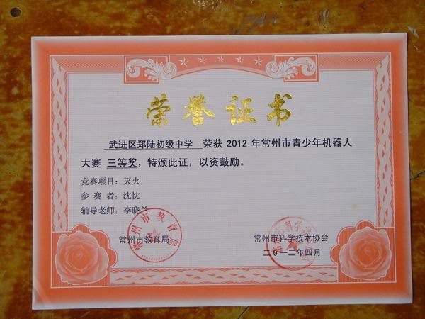 沈忱同学荣获常州市青少年机器人大赛“灭火”项目“三等奖”