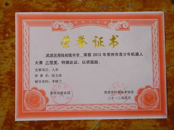 陆文涛同学荣获常州市青少年机器人大赛“人形”项目“三等奖”