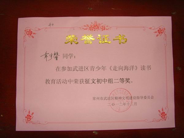 初二(1)班章宇馨同学在《走向海洋》读书活动中,成绩显著荣获区“二等奖”