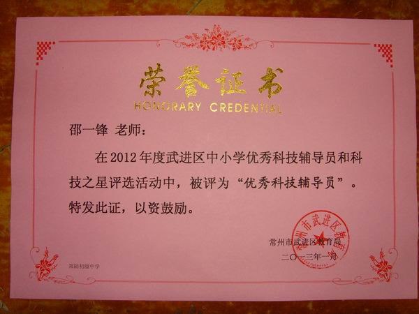 邵一锋老师被评为2012年“优秀科技辅导员”