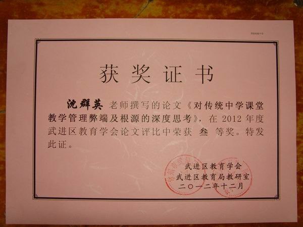 沈群英老师的论文《对传统中学课堂教学管理弊端及根源的深度思考》被评为区教育学会论文“三等奖”