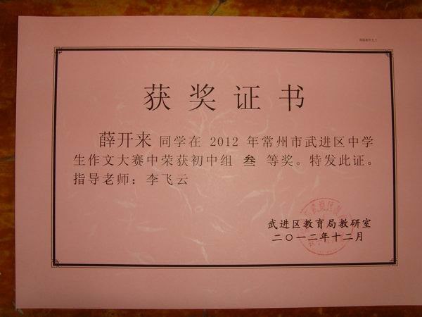 初三(2)班薛开来同学在武进区作文大赛中荣获三等奖
