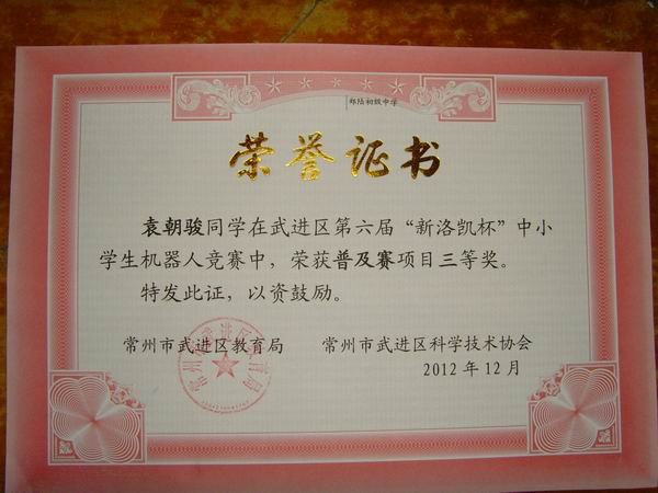 初二(1)班 袁朝俊 同学在区第六届“新洛凯杯”机器人竞赛中荣获 “三等奖”