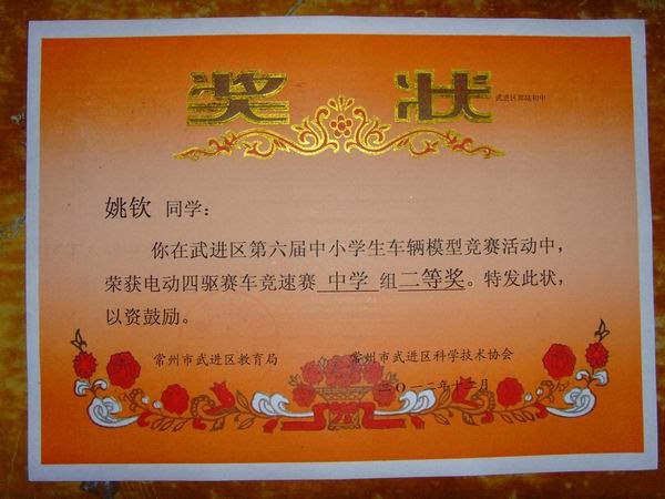 初三(5)班 姚钦 同学 在区第六届车辆模型竞赛中荣获 “二等奖”