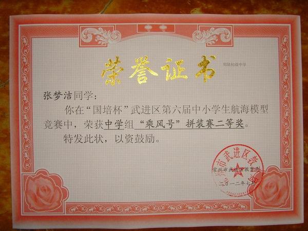 张梦洁同学 在区第六届“国培杯”航海模型竞赛中荣获“二等奖”