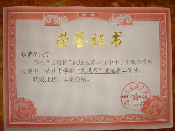 张梦洁同学 在区第六届“国培杯”航海模型“竞速赛 ”竞赛中荣获“二等奖”