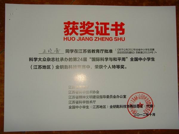 初三(2)班 王晓蕾 同学在江苏省第二十四届“国际科学与和平周”“金钥匙”竞赛中荣获“特等奖”