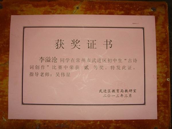 初二(7)班李溢沧同学在区“古诗词”创作中荣获“二等奖”
