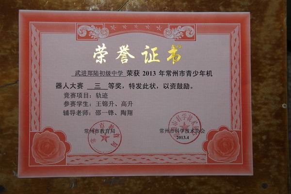 二(6)班王锦升、一(6)班高升同学荣获常州市机器人大赛“轨迹”三等奖