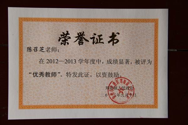 陈召芝同志被评为2012-2013学年度“镇优秀教师”