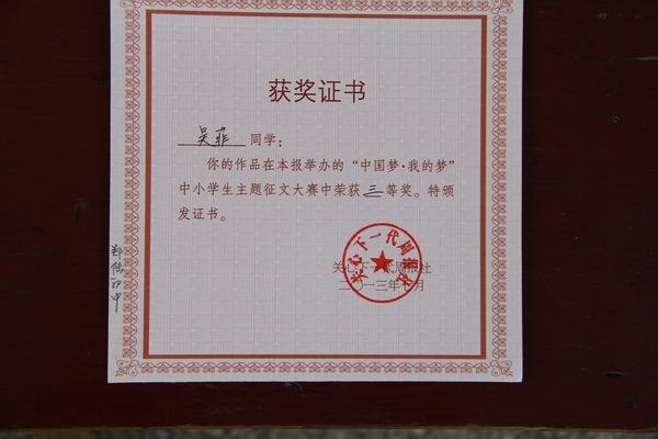 初三(3)班 吴菲同学的作品在“中国梦•我的梦”征文大赛中荣获“三等奖”