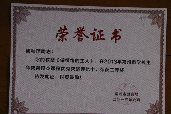 周秋萍同志的教案《做情绪的主人》在2013年常州市生命教育校本课程优秀教案评比中荣获“二等奖”