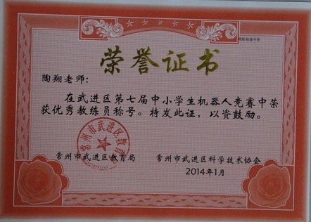 陶翔老师在武进区第七届机器人竞赛中被评为优秀教练员