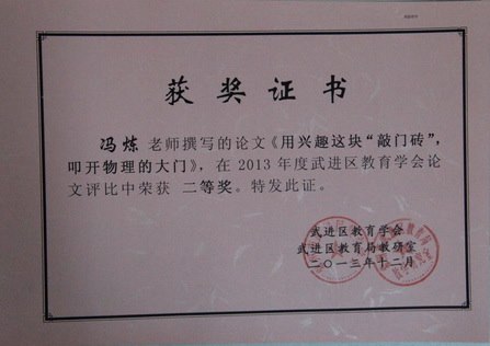 冯炼老师的论文《用兴趣这块“敲门砖”,叩开物理的大门》在2013年武进区教育学会论文评比中获二等奖