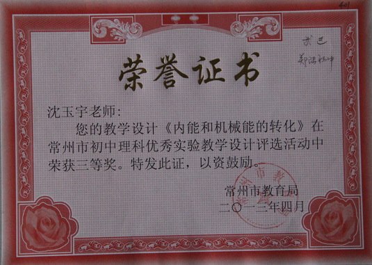 沈玉宇老师的教学设计在常州市初中理科优秀实验教学设计评选活动中荣获三等奖