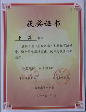 卜萍老师在第六届生命之水主题教育活动中,荣获主题优秀指导老师