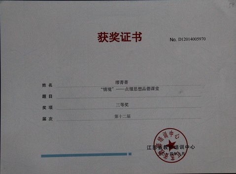 缪菁菁老师的论文《让“情境”——点缀思想品德课堂》在省“蓝天杯”论文评比中荣获三等奖
