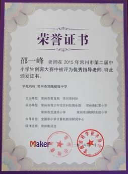 邵一峰老师在2015年常州市第二届中小学生创客大赛中被评为优秀指导老师
