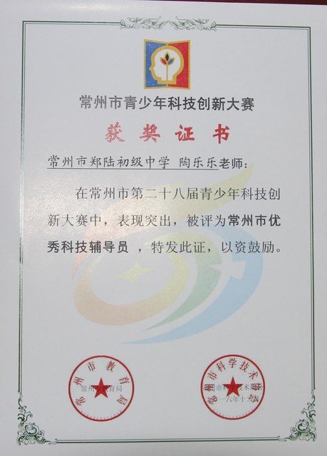 陶乐乐老师在常州市第二十八届青少年科技创新大赛中,表现突出,被评为常州市优秀科技辅导员