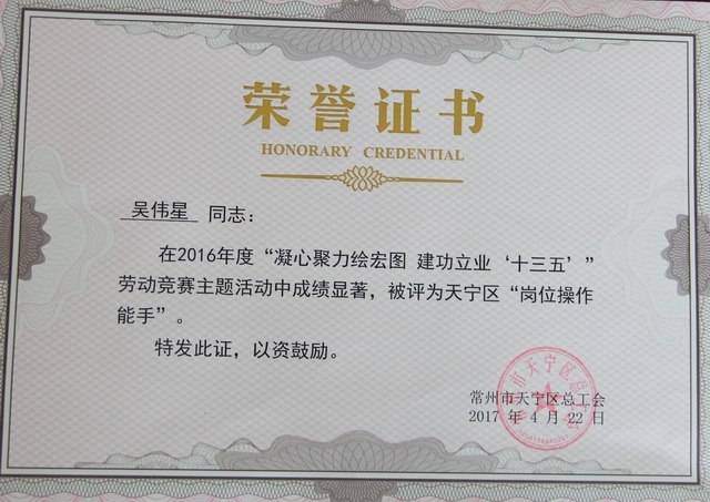 2017,04吴伟星同志在2016年度“凝心聚力绘宏图 建功立业‘十三五’”劳动竞赛主题活动中成绩显著,被评为天宁区“岗位操作能手”